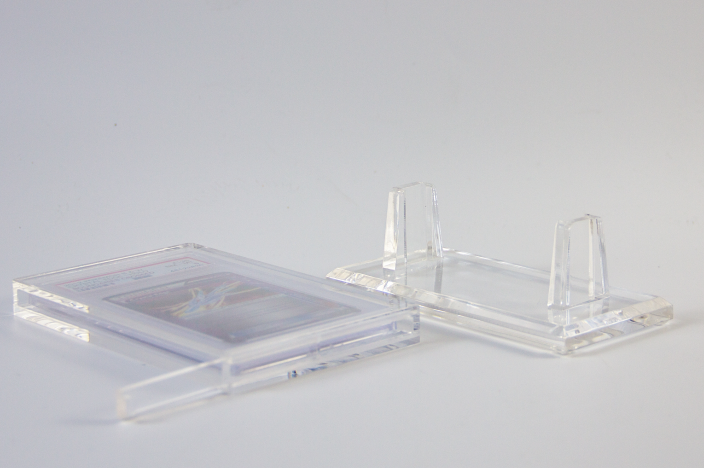 Die Hauptfunktion dieses Acryl-Trophäenständers besteht darin, bewertete Sammelkarten in Slabs sicher zu präsentieren: Er hält das Slab sicher in einer erhöhten, geneigten Position, um die Sichtbarkeit des Kartenmotivs und der Bewertungsinformationen (z. B. Details des PSA-Labels) zu maximieren. Gleichzeitig dient er als Schutzvorrichtung, indem er das Slab aufrecht hält und von anderen Gegenständen trennt, um Kratzer oder Beschädigungen zu vermeiden. Wertvolle bewertete Karten lassen sich so ordentlich und präsentationsfertig auf Regalen, Schreibtischen oder in Vitrinen präsentieren.