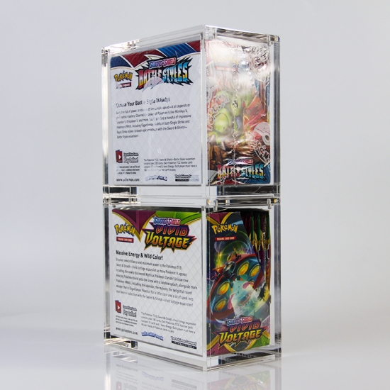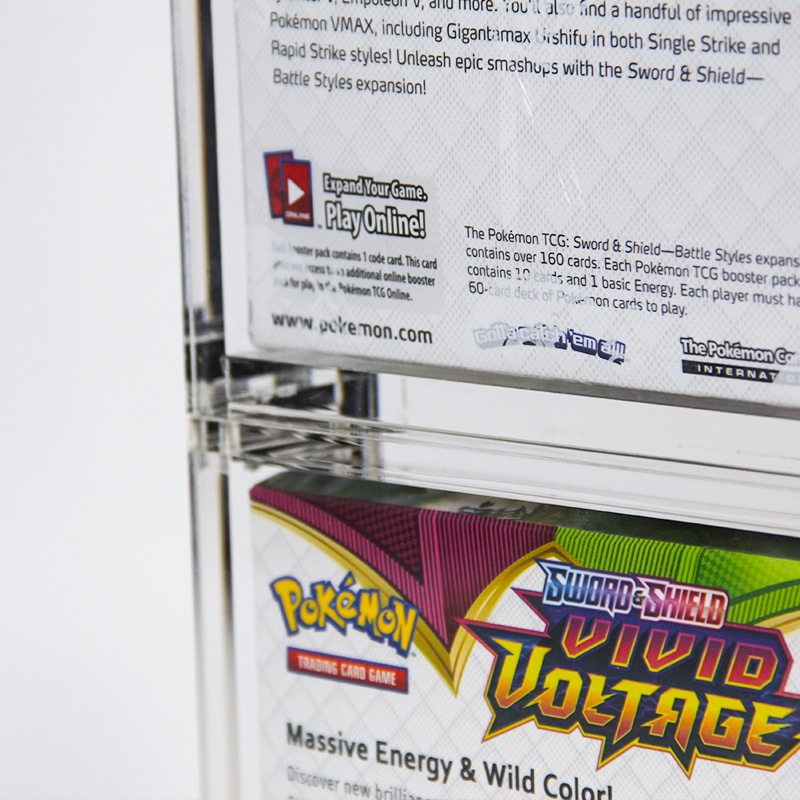 Die aus klarem, robustem Acrylmaterial gefertigten Gehäuse umschließen sicher eine einzelne Boosterbox und präsentieren deren Originalgrafik durch die transparenten Seitenwände. Mehrere Einheiten können vertikal gestapelt werden, um Sammlungen platzsparend zu organisieren und auszustellen. Dies macht sie ideal für Sammler, Händler oder Enthusiasten von Sammelkartenspielen, die ihre Boosterbox-Sets schützen und präsentieren möchten.