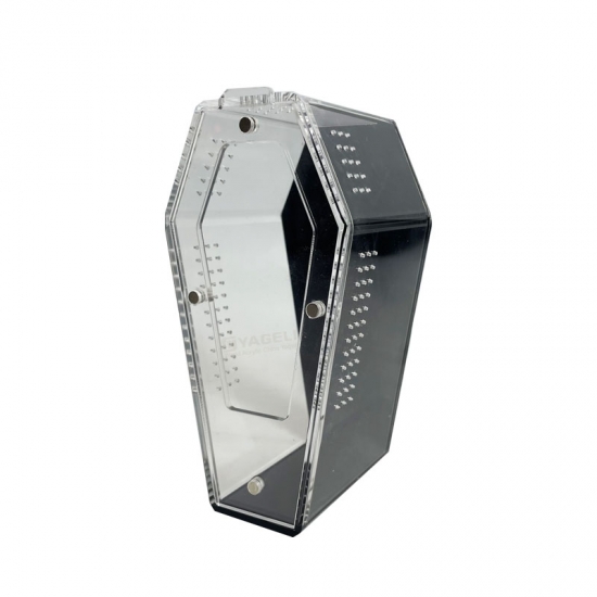 Mit 97 % UV-Beständigkeit ist dieses Terrarium im Gegensatz zu herkömmlichen Kunststoffterrarien aus robustem Acryl gefertigt, bruchfest und dennoch leicht. Die schwarze Rückseite bietet einen kontrastreichen Hintergrund, der die Farben und Bewegungen Ihrer Spinne besser sichtbar macht. Die präzise gebohrten Belüftungslöcher (integriert in das Design) gewährleisten optimale Luftzirkulation, während der sichere Schnappverschluss ein Entkommen verhindert, ohne den Zugang zum Füttern oder zur Pflege einzuschränken.
